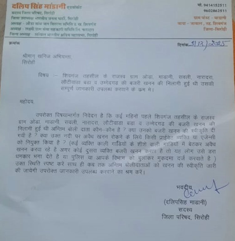 जिला परिषद सदस्य दलीप सिंह मांडानी ने सिरोही जिले के खनिज अभियंता को एक महत्वपूर्ण पत्र प्रेषित किया है। इस पत्र में उन्होंने शिवगंज तहसील के राजस्व ग्राम ओडा, मांडाणी, सवली, नारादरा, लोटीवाडा बड़ा और उमदगढ़ के आसपास के क्षेत्रों में हो रहे अवैध खनन और खनिज सामग्री के परिवहन पर गहरी चिंता व्यक्त की है।