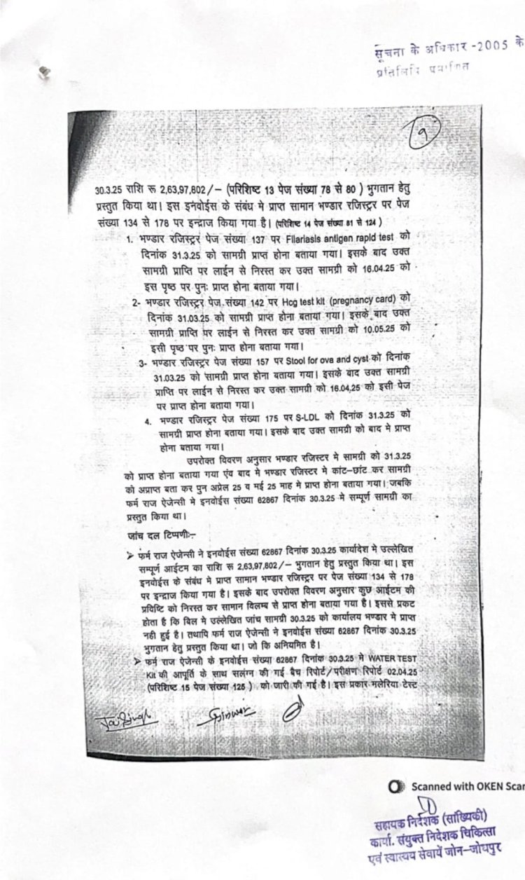 सबसे चौंकाने वाला मामला प्रेग्नेंसी टेस्ट किट की खरीद में सामने आया है। जैसलमेर जिले में जो किट मात्र 6.5 रुपए में खरीदी गई उसे जालोर में 25 रुपए की दर पर खरीदा गया है।इस एक आइटम की खरीद से ही सरकार को 16 लाख 18 हजार रुपए से अधिक का नुकसान झेलना पड़ा है। इसके अलावा यूरिन स्ट्रिप और एचबीएसएजी टेस्ट किट की खरीद में भी लाखों रुपए का गबन किया गया है।