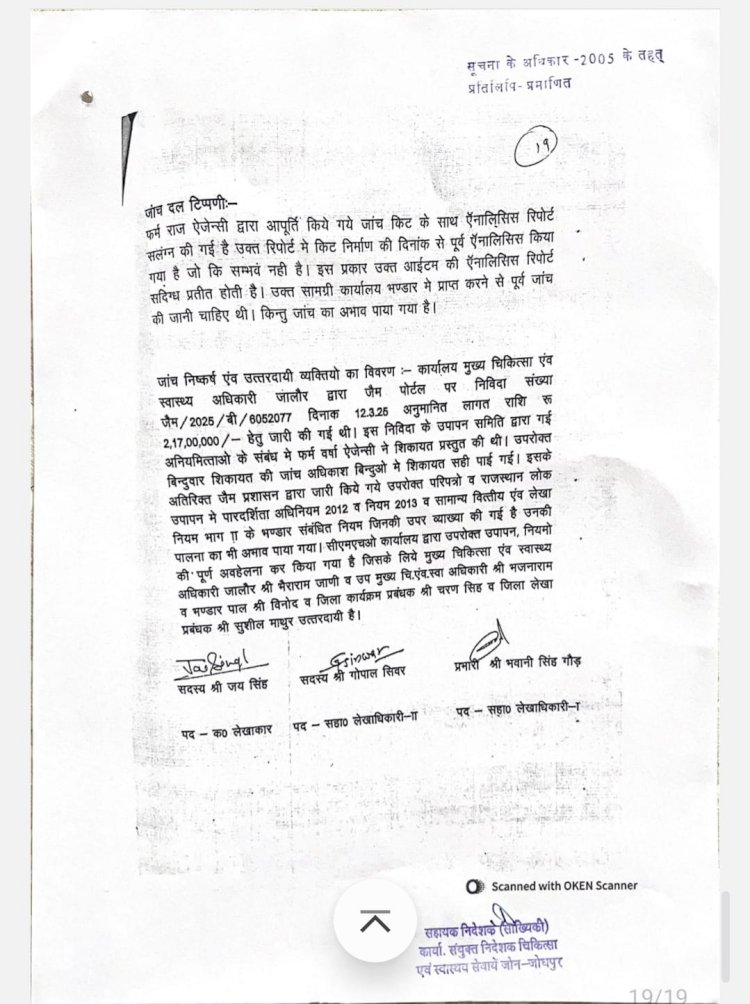 इस पूरे मामले की शिकायत एक अन्य फर्म ने जयपुर स्थित चिकित्सा एवं स्वास्थ्य विभाग के वित्तीय सलाहकार से की थी। शिकायत के बाद जोधपुर जोन के अधिकारियों की एक तीन सदस्यीय जांच कमेटी गठित की गई थी।इस कमेटी ने सितंबर 2025 में अपनी विस्तृत रिपोर्ट उच्चाधिकारियों को सौंप दी थी। रिपोर्ट में टेंडर प्रक्रिया और खरीद दरों में भारी अनियमितताओं की पुष्टि की गई है।