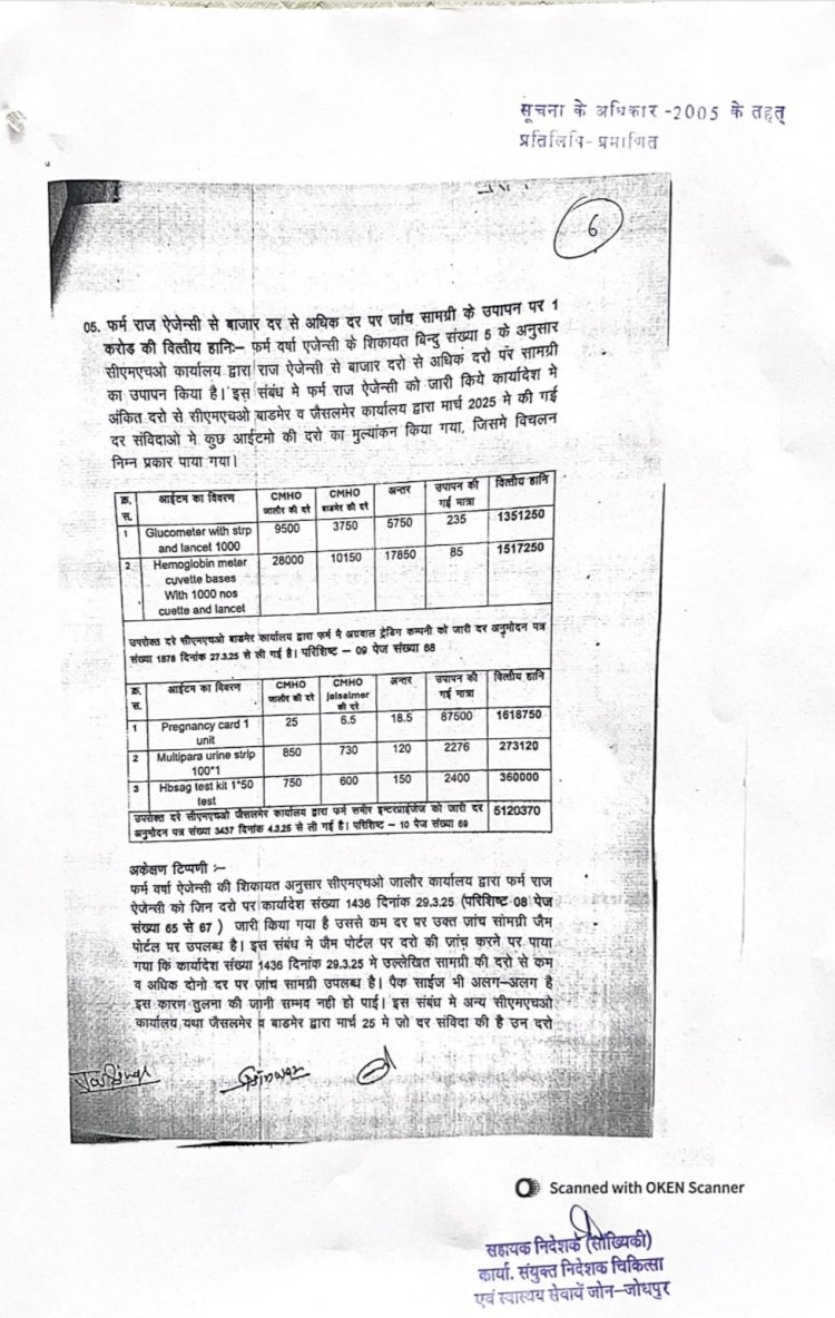 जांच में सामने आया है कि सरकारी अस्पतालों के लिए खरीदे गए उपकरण बाजार की वास्तविक दरों से कई गुना अधिक कीमत पर खरीदे गए। हीमोग्लोबिन मीटर जिसकी वास्तविक कीमत लगभग 10 हजार रुपए है उसे 28 हजार रुपए में खरीदा गया।इसी प्रकार जो ग्लूकोमीटर अन्य जिलों में 3750 रुपए में उपलब्ध था उसे जालोर में 9500 रुपए की दर से खरीदा गया है। इस भारी अंतर ने स्वास्थ्य विभाग की खरीद प्रक्रिया पर गंभीर सवाल खड़े कर दिए हैं।