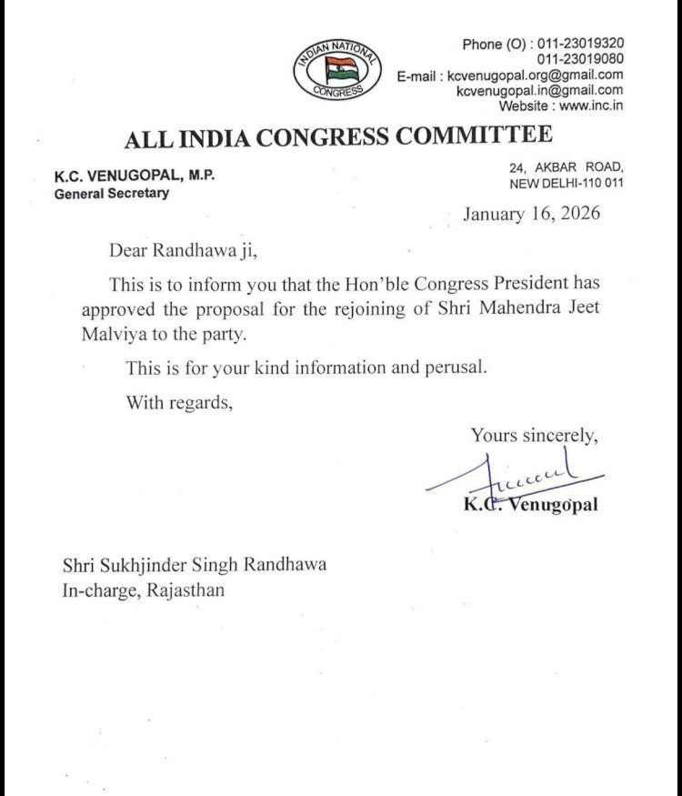 - महेंद्रजीत सिंह मालवीया की कांग्रेस में आधिकारिक तौर पर वापसी हो गई है।