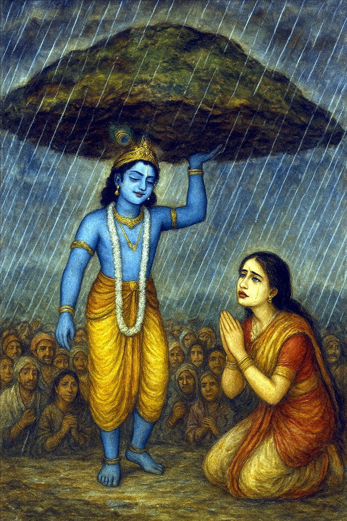 वह संवादहीनता, वह दूरी जन्मों तक चली। पर गोवर्धन पर्वत के नीचे, जब तूफान से भयभीत माधवी ने शरण ली और देखा कि वही बालक एक उंगली पर गिरि धारण किए खड़ा है — तब उसके नेत्र अश्रुधार बन गए। वह उस दिव्यता को देख न सकी, केवल रोती रही। और तभी कान्हा बोले —