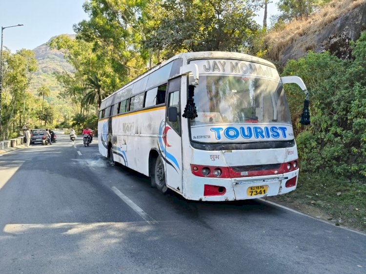 माउंट आबू के चुंगी नाके से कुछ ही दूरी पर बस का टायर फटने से उसमें अचानक आग लग गई। आग लगते ही बस का ड्राइवर घबराकर वाहन को मौके पर ही छोड़कर भाग निकला।