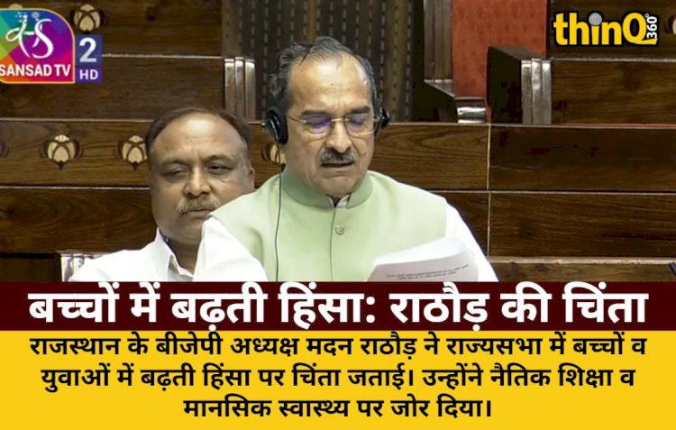 नई दिल्ली: राजस्थान (Rajasthan) के बीजेपी अध्यक्ष (BJP President) मदन राठौड़ (Madan Rathore) ने राज्यसभा (Rajya Sabha) में बच्चों व युवाओं में बढ़ती हिंसा पर चिंता जताई। उन्होंने नैतिक शिक्षा व मानसिक स्वास्थ्य पर जोर दिया।
