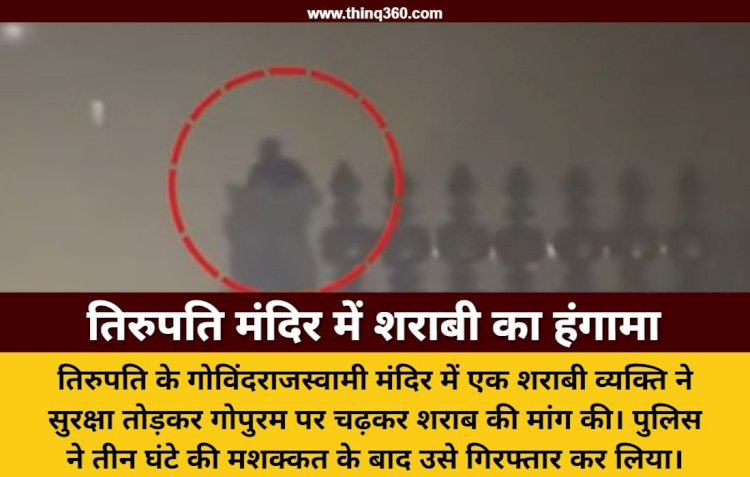 तिरुपति | आंध्र प्रदेश के प्रसिद्ध तिरुपति शहर में शुक्रवार देर रात एक हैरान कर देने वाली घटना सामने आई। गोविंदराजस्वामी मंदिर के ऊपर एक नशे में धुत व्यक्ति चढ़ गया और काफी देर तक हंगामा करता रहा। इस व्यक्ति की पहचान तेलंगाना के निजामाबाद जिले के रहने वाले कुट्टाडी तिरुपति के रूप में हुई है जो सुरक्षा गार्डों की नजरों से बचकर मंदिर के ऊपरी हिस्से तक पहुंचने में कामयाब रहा।