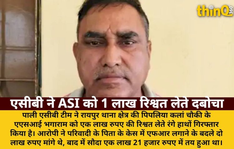 भ्रष्टाचार निरोधक ब्यूरो की पाली द्वितीय इकाई ने शुक्रवार को यह बड़ी कार्रवाई की। पिपलिया कलां चौकी प्रभारी एएसआई भगाराम को एक लाख रुपए की रिश्वत लेते हुए मौके पर ही दबोच लिया गया।