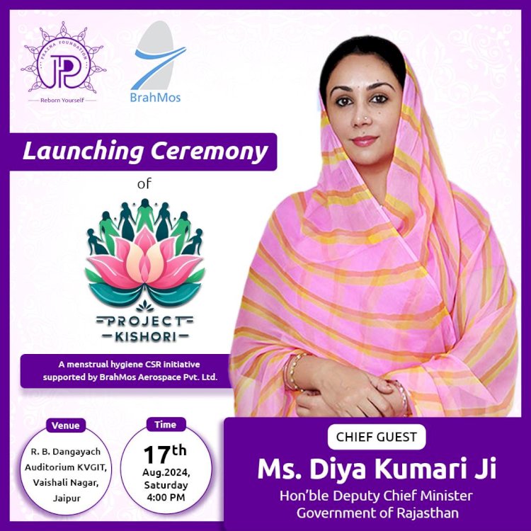 प्रजना फाउण्डेशन एवं ब्रह्मोस एयरोस्पेस की ओर से महिला माहवारी स्वच्छता के लिए चलाए जा रहे अभियान 'प्रोजेक्ट किशोरी' का शुभारंभ शनिवार, 17 अगस्त को शाम 4 बजे राजस्थान की उप मुख्यमंत्री दिया कुमारी करेंगी।