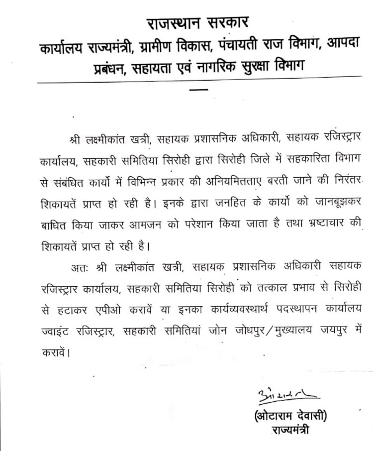 सिरोही | जिले में शांतिनगर हाउसिंग सोसाइटी के घोटाले के विवाद के बीच एक एक पत्र पर बात करन बनती है। सहकारिता मंत्री को मंत्री ओटाराम देवासी के एक पत्र को लेकर सवाल उठ रहे हैं। हालांकि पार्ट तीन वाली न्यूज में उल्लेख किया था कि मंत्री देवासी ने इस तरह के किसी पत्र को लिखने से साफ इनकार किया है। जिससे अब यह लगता है कि मंत्री का नाम नाम और हस्ताक्षर फर्जी तरीके से कोई और इस्तेमाल कर रहा है। वह कौन है। कोई परिचित—रिश्तेदार या कोई और...!