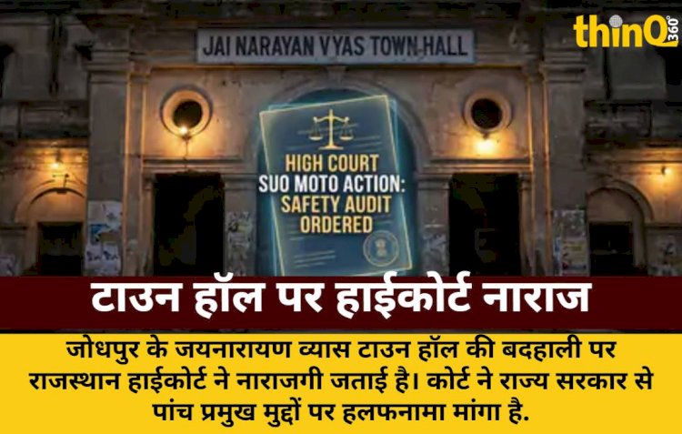 जोधपुर (Jodhpur) के जयनारायण व्यास टाउन हॉल (Jaynarayan Vyas Town Hall) की बदहाली पर राजस्थान हाईकोर्ट (Rajasthan High Court) ने नाराजगी जताई है। कोर्ट ने राज्य सरकार से पांच प्रमुख मुद्दों पर हलफनामा मांगा है, अगली सुनवाई चार सप्ताह बाद होगी।