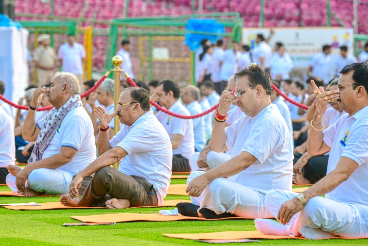 जयपुर। 10वें अन्तर्राष्ट्रीय योग दिवस पर शुक्रवार को एसएमएस स्टेडियम (SMS Stadium) में राज्य स्तरीय समारोह आयोजित किया गया। आयुर्वेद विभाग की ओर से आयोजित इस कार्यक्रम में जनप्रतिनिधियों, अधिकारियों, विद्यार्थियों एवं बड़ी संख्या में योग प्रेमियों (yoga lovers) ने भाग लिया।
