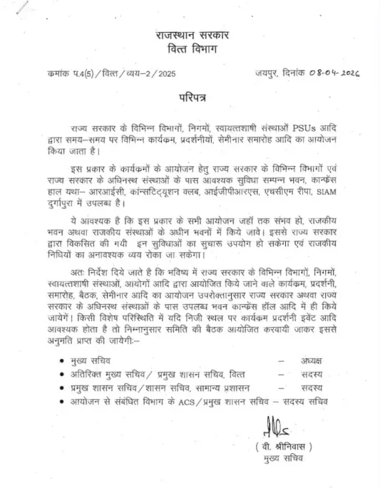 राजस्थान: सरकारी कार्यक्रमों पर बड़ा फैसला: राजस्थान सरकार का बड़ा फैसला: अब होटलों में नहीं होंगे सरकारी कार्यक्रम, फिजूलखर्ची रोकने के लिए मुख्य सचिव ने जारी किए कड़े निर्देश