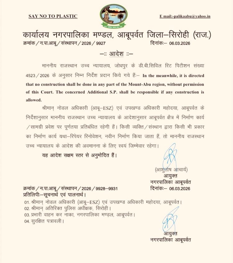 6 मार्च शुक्रवार को राजस्थान उच्च न्यायालय की डबल बेंच, जिसमें माननीय कार्यवाहक मुख्य न्यायाधीश संजीव प्रकाश शर्मा और वरिष्ठ न्यायाधीश बलजिंदर सिंह संधु शामिल थे, ने एक महत्वपूर्ण निर्णय सुनाया। याचिकाकर्ता नितिन जैन, मनोज चौरसिया और अन्य द्वारा दायर जनहित याचिका (PIL) पर सुनवाई करते हुए कोर्ट ने माउंट आबू सहित आबूरोड के तलहटी क्षेत्र में चल रहे सभी प्रकार के निर्माण कार्यों पर तुरंत प्रभाव से रोक लगाने का आदेश दिया था। न्यायालय का यह आदेश इस क्षेत्र की पारिस्थितिक संवेदनशीलता को देखते हुए अत्यंत महत्वपूर्ण माना जा रहा था।