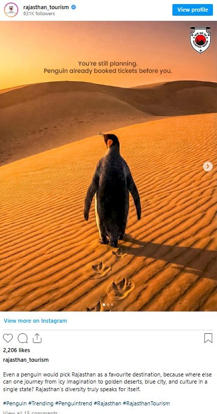 राजस्थान पर्यटन विभाग ने सर्दियों के सीजन को भुनाने के लिए इस अनोखे अभियान की शुरुआत की है। विभाग ने अपने आधिकारिक इंस्टाग्राम हैंडल पर पेंगुइन की तस्वीरों की एक पूरी सीरीज साझा की है। इन तस्वीरों के जरिए यह संदेश देने की कोशिश की गई है कि जब दुनिया के सबसे ठंडे इलाके का जीव राजस्थान की गुनगुनी धूप और यहां के ठाट-बाट का आनंद लेने आ सकता है, तो बाकी सैलानी क्यों पीछे रहें। पर्यटन विभाग की यह रचनात्मकता लोगों को काफी प्रभावित कर रही है और इसे विंटर टूरिज्म को बढ़ावा देने का एक मास्टरस्ट्रोक माना जा रहा है।
