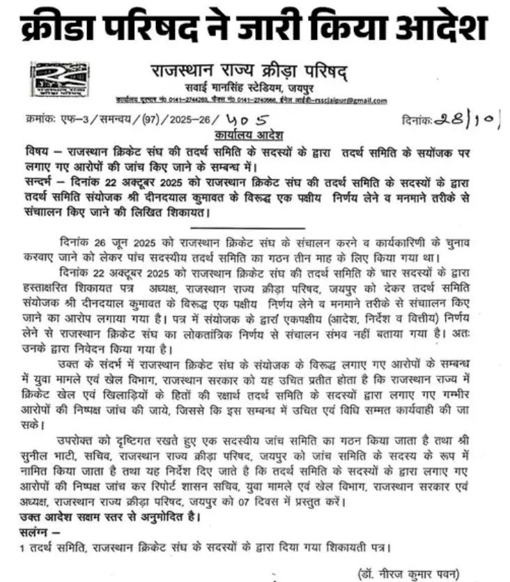 राजस्थान खेल परिषद ने राजस्थान क्रिकेट एसोसिएशन (RCA) की एडहॉक कमेटी के कन्वीनर दीनदयाल कुमावत के खिलाफ जांच के आदेश दिए हैं।