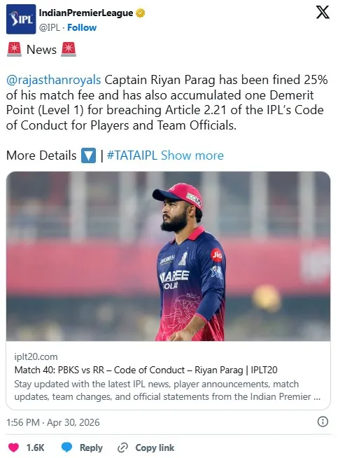 - बीसीसीआई ने पराग पर मैच फीस का 25 प्रतिशत जुर्माना और डिमेरिट पॉइंट लगाया।