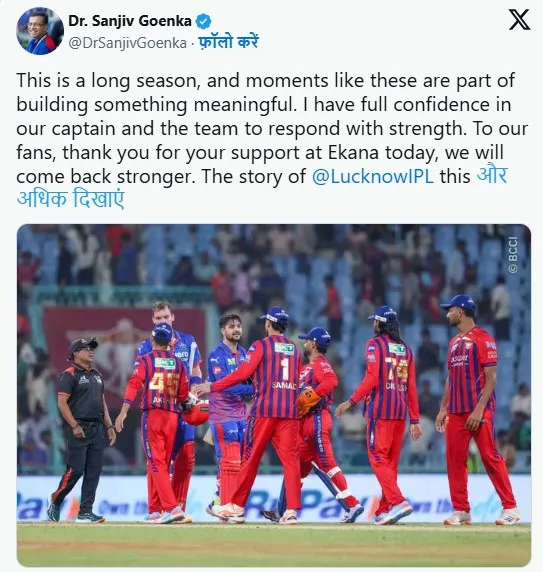 मैदान पर गुस्से के बावजूद, संजीव गोयनका ने बाद में सोशल मीडिया पर नरम रुख अपनाया। उन्होंने 'X' पर टीम और कप्तान के प्रति अपना विश्वास जताया।