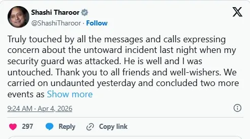 - शशि थरूर ने सोशल मीडिया पर पोस्ट साझा कर बताया कि वह सुरक्षित हैं और कार्यक्रम जारी रखेंगे।
