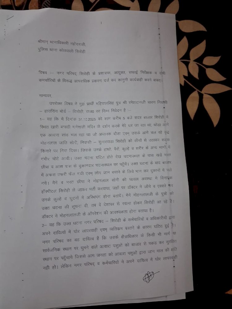 सिरोही: सिरोही (Sirohi) में आवारा सांड (stray bull) के हमले से बुजुर्ग मोहनलाल सोनी (Mohanlal Soni) घायल हुए। भाजपा नेता महिपाल चारण (Mahipal Charan) ने कलेक्टर (Collector) व आयुक्त (Commissioner) के खिलाफ पुलिस (Police) में परिवाद दिया है, न्यायिक अवमानना (judicial contempt) का भी खतरा है।