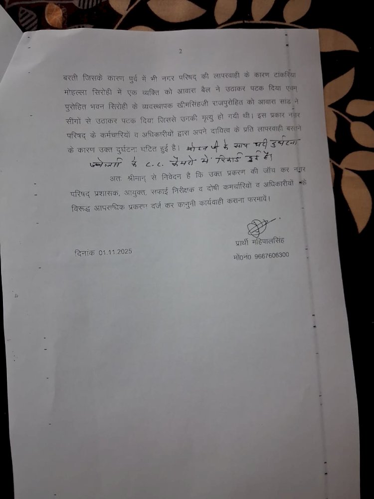 महिपाल चारण ने आरोप लगाया है कि यह घटना नगर परिषद सिरोही के कर्मचारियों और अधिकारियों द्वारा अपने दायित्वों में घोर लापरवाही बरतने के कारण हुई है।