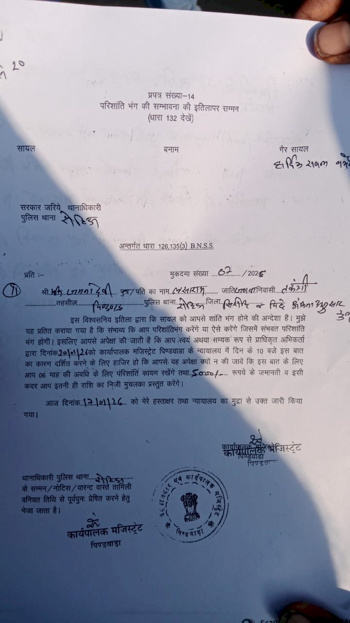 BNSS की धारा 126 व 135(3) के तहत जारी नोटिसों पर आज पिण्डवाड़ा कोर्ट में एक साथ बड़ी सुनवाई हुई। माननीय कार्यपालक मजिस्ट्रेट पिण्डवाड़ा के समक्ष दर्जनों ग्रामीणों की पेशी हुई। कोर्ट परिसर में सुबह से ही भारी संख्या में समर्थक और सामाजिक कार्यकर्ता मौजूद रहे।