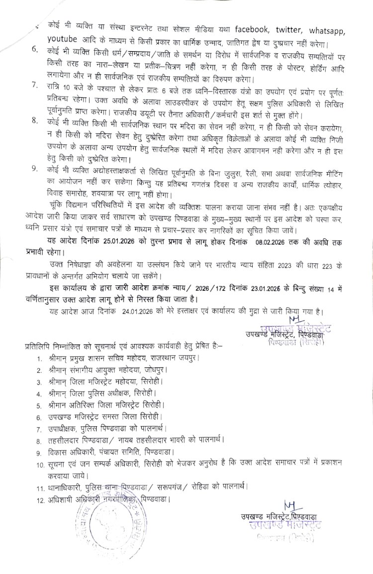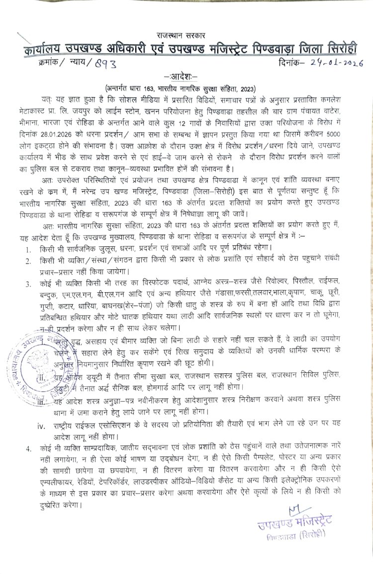 सिरोही | राजस्थान के सिरोही जिले में स्थित पिंडवाड़ा उपखंड क्षेत्र इन दिनों भारी तनाव और विरोध का केंद्र बना हुआ है। प्रस्तावित चूना पत्थर खनन परियोजना के खिलाफ ग्रामीणों का गुस्सा सातवें आसमान पर है। हालात को देखते हुए जिला मजिस्ट्रेट अल्पा चौधरी ने रविवार से पूरे पिंडवाड़ा क्षेत्र में धारा 163 लागू कर दी है। यह आदेश 8 फरवरी तक प्रभावी रहेंगे, जिसका मुख्य उद्देश्य क्षेत्र में शांति और कानून व्यवस्था बनाए रखना है।