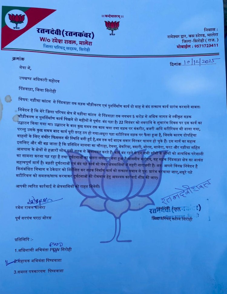 ज़िला परिषद सदस्य रतन देवी रावल ने इस गंभीर समस्या को लेकर उपखण्ड अधिकारी पिंडवाड़ा को एक विस्तृत पत्र लिखा है। उन्होंने पत्र में संबंधित विभाग और ठेकेदार को तत्काल सड़क निर्माण कार्य फिर से शुरू करने का निर्देश देने की पुरजोर मांग की है।