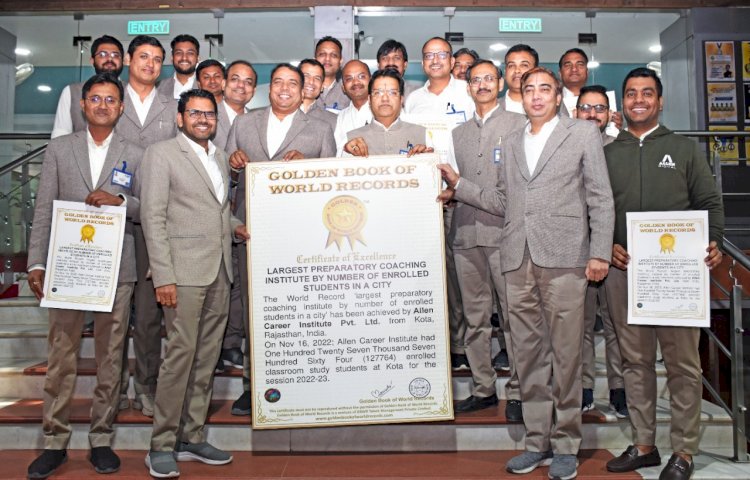 एलन इंस्टीट्यूट ने रचा एक और कीर्तिमान: एलन कोचिंग ने गोल्डन बुक ऑफ वर्ल्ड रिकॉर्ड्स में धमाकेदार एंट्री ली, एक शहर, एक संस्थान में सर्वाधिक 1 लाख 27 हजार 764 क्लासरूम स्टूडेंट्स का रिकॉर्ड
