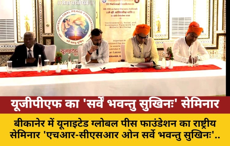 बीकानेर: बीकानेर में यूनाइटेड ग्लोबल पीस फाउंडेशन (United Global Peace Foundation) का राष्ट्रीय सेमिनार 'एचआर-सीएसआर on सर्वे भवन्तु सुखिनः' भारतीय मूल्यों को ईएसजी (ESG) फ्रेमवर्क से जोड़ने की पहल है। यूजीपीएफ ने एक वर्ष में सैकड़ों युवाओं को ₹4 करोड़ से अधिक की सामाजिक सहायता दी है। यह सम्मेलन 11-12 अक्टूबर 2025 को लक्ष्मी निवास पैलेस (Laxmi Niwas Palace) में होगा।