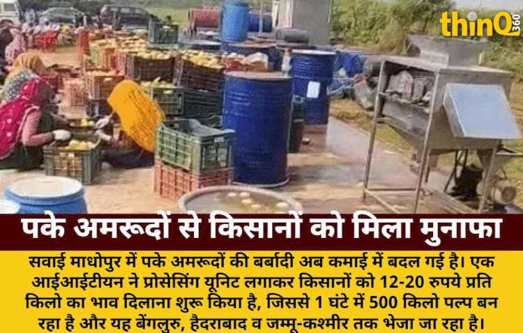 सवाई माधोपुर (Sawai Madhopur) में पके अमरूदों की बर्बादी अब कमाई में बदल गई है। एक आईआईटीयन (IITian) ने प्रोसेसिंग यूनिट (processing unit) लगाकर किसानों को 12-20 रुपये प्रति किलो का भाव दिलाना शुरू किया है, जिससे 1 घंटे में 500 किलो पल्प (pulp) बन रहा है और यह बेंगलुरु (Bengaluru), हैदराबाद (Hyderabad) व जम्मू-कश्मीर (Jammu-Kashmir) तक भेजा जा रहा है।