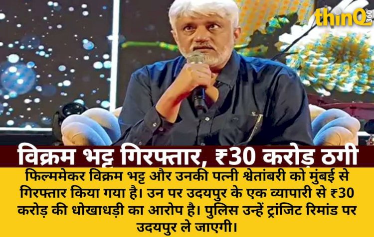 - फिल्ममेकर विक्रम भट्ट और उनकी पत्नी श्वेतांबरी को मुंबई से गिरफ्तार किया गया। उदयपुर के व्यापारी से ₹30 करोड़ की धोखाधड़ी का आरोप। पुलिस ने यारी रोड स्थित साली के घर से पकड़ा, ट्रांजिट रिमांड के लिए आवेदन करेगी। व्यापारी की पत्नी की बायोपिक बनाने के नाम पर ठगी का आरोप।