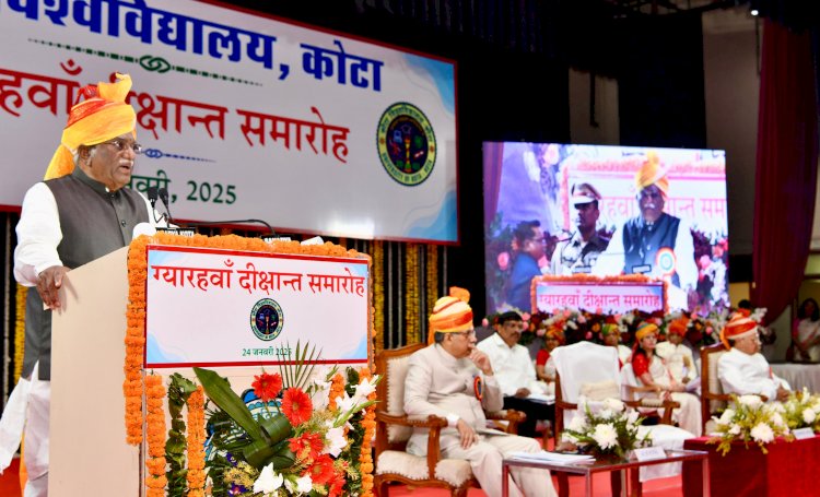 राज्यपाल एवं कुलाधिपति हरिभाऊ बागड़े शुक्रवार को कोटा विश्वविद्यालय के 11वें दीक्षांत समारोह में संबोधित कर रहे थे। समारोह को संबोधित करते हुए राज्यपाल ने स्वामी विवेकानंद की शिक्षाओं को उद्धृत करते हुए कहा कि शिक्षा का उद्देश्य मनुष्य के मानसिक और नैतिक विकास में निहित है। उन्होंने पूर्व राष्ट्रपति डॉ. ए.पी.जे. अब्दुल कलाम का उल्लेख करते हुए कहा कि जीवन में निरंतर सीखना आवश्यक है क्योंकि ज्ञान ही विकास की कुंजी है।