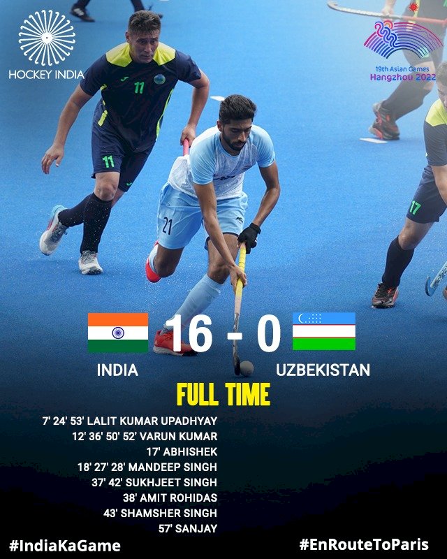 भारतीय पुरुष हॉकी टीम ने रविवार को एशियन गेम्स 2023 के अपने पहले मैच में उज्बेकिस्तान को 16-0 से हराकर धमाकेदार शुरुआत की। क्रैग फुल्टन की टीम ने इस मैच में पूरी तरह से दबदबा बनाया और उज्बेकिस्तान को कोई मौका नहीं दिया।