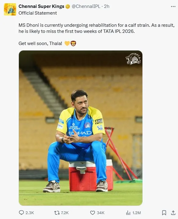 एमएस धोनी को काफ स्ट्रेन के कारण आईपीएल 2026 के शुरुआती दो हफ्तों से बाहर होना पड़ा है। सीएसके ने आधिकारिक तौर पर उनके रिहैब की पुष्टि की है।