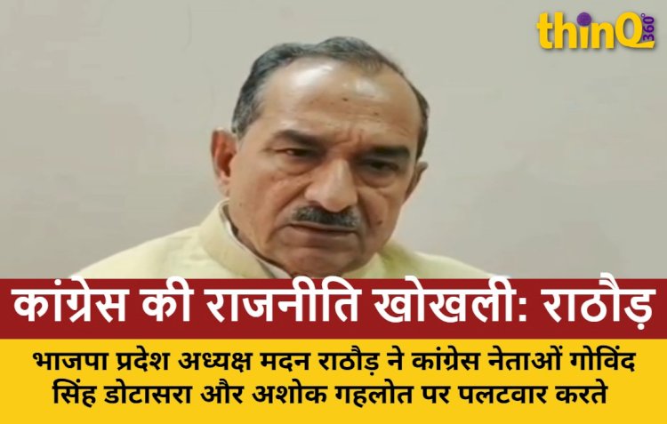 भाजपा प्रदेश अध्यक्ष मदन राठौड़ (Madan Rathore) ने कांग्रेस (Congress) नेताओं गोविंद सिंह डोटासरा (Govind Singh Dotasra) और अशोक गहलोत (Ashok Gehlot) पर पलटवार करते हुए कहा कि कांग्रेस की राजनीति सस्ती बयानबाज़ी और खोखले नारों तक सिमट गई है।