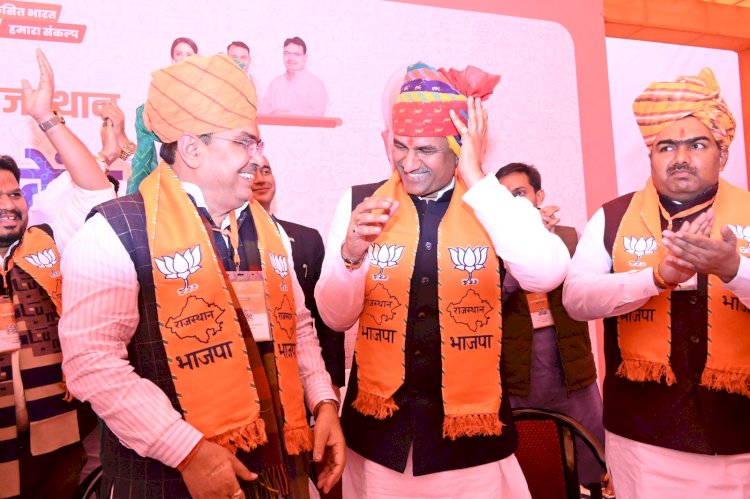 आज भाजपा पदाधिकारी बैठक में मुख्यमंत्री भजनलाल शर्मा ने उनके संकल्प को पूर्ण कराते हुए माला और साफा पहनाकर सीपी जोशी का स्वागत और अभिनंदन किया।