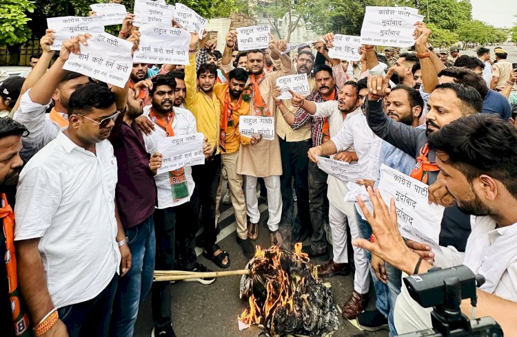 जयपुर, 2 जुलाई 2024: भारतीय जनता पार्टी (भाजपा) के युवा मोर्चा ने आज राहुल गांधी के एक विवादित बयान के खिलाफ प्रदर्शन किया और उन्हें हिन्दू समाज के खिलाफ बताया। राहुल गांधी ने लोकसभा में हिन्दुओं को 'हिंसक' बताया और उनकी भावनाओं को अपमानित किया है, इस पर भाजपा युवा मोर्चा के प्रदेशाध्यक्ष अंकित गुर्जर चेची ने भाजपा कार्यकर्ताओं के साथ एक प्रदर्शन किया।