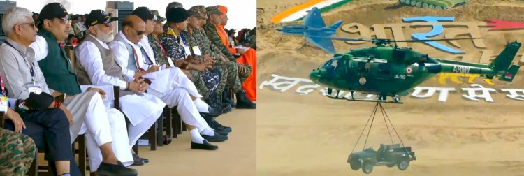 नरेन्द्र मोदी मंगलवार को जैसलमेर के पोकरण में भारत शक्ति अभ्यास के अवसर पर आयोजित प्रदर्शन का अवलोकन कर रहे थे। मुख्यमंत्री भजनलाल शर्मा भी भारतीय सेनाओं के शौर्य के साक्षी बने। प्रधानमंत्री ने कहा कि वीरता और कौशल का यह प्रदर्शन नए भारत की गूंज है।