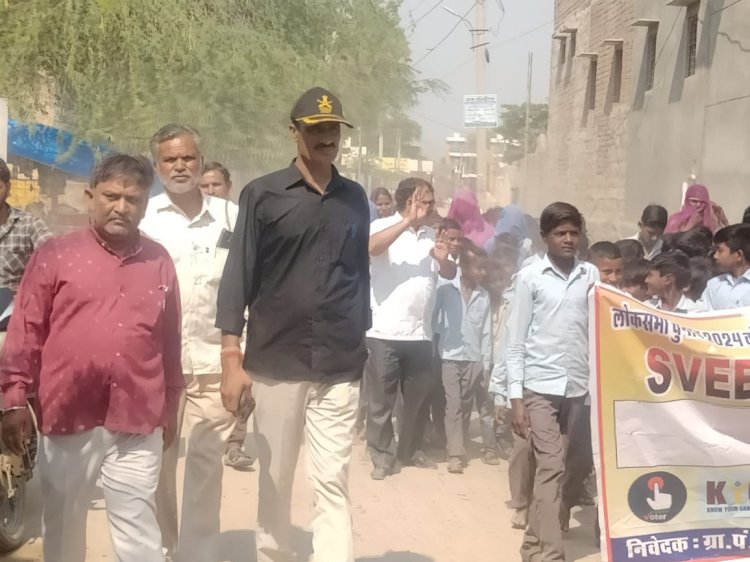 रैली का आयोजन ग्राम पंचायत कार्यालय से गांव के मुख्य मार्ग व गली गली में डीजे की धुन पर मतदाताओ को 26अपरेल मतदान के लिए अपील की ,गांव के आम चौहटे पर ग्रामीणों बालक बालिकाओं व विद्यालय स्टाफ के साथ मानव श्रृंखला बनाकर मतदान के लिए संदेश दिया वहीं डीजे पर बजने वाले गीत पर ग्रामीणों व बालकों ने शानदार नृत्य कर ग्रामीणों को आकर्षित किया