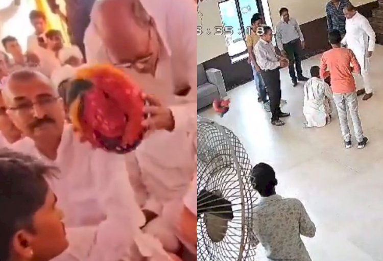चितौड़गढ़ के बेंगू से कांग्रेस विधायक राजेंद्र सिंह बिधूड़ी अपने बेटे के लिए नौकरी की गुहार लेकर आए बुजुर्ग की पगड़ी को लात मार कर उछालते हुए दिखाई दे रहे है।